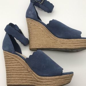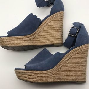 Marc Fisher Haya Scalloped Edge Espadrille Wedge Shoes Leather Blue Size 9M.