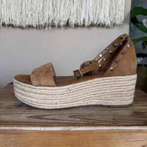 The Jazlyn Sandals from Marc Fisher is constructed in tan genuine suede leather, synthetic lining, jute raffia balance and rubber bottom sole. They feature a round open toe box, thick vamp strap, closed back heel, adjustable ankle wrap strap w/ silver tone pyramid studs and a platform slight wedge silhouette. These are summer, going out, classic, timeless, wedding guest, garden party, neutral, italian summer, beachy, vacation, boho vibes.