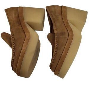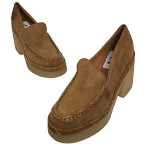 Marc Fisher LTD "Lina" suede heeled platform loafers in a classic silhouette with a modern update. 4.00 in / 100 mm block heel; 1.50 in / 40 mm platform Almond moc toe Notched vamp Slip-on style Manmade outsole Lining: Synthetic Imported