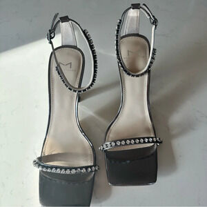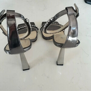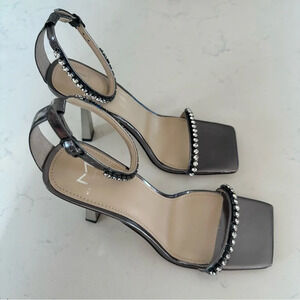 Jewel embellishments accentuate the slim straps of a metallic leather sandal framed by a sleek squared toe and flared heel.