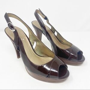 MARC FISHER Open Toe Patent Leather Slingback Platform Heels in Brown. Women’s Size 8.