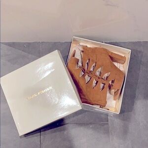 Mark Fisher tan camel colored suede caged booties. Thick high heel with silver back zipper. Great preowned condition. Comes with box.