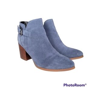 Suede leather blue ankle booties, pointed heel, 3" heel, size 8.