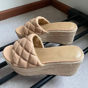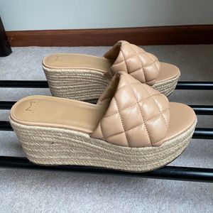 A chunky espadrille-style platform wedge elevate a stylish sandal topped with a quilted strap.