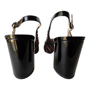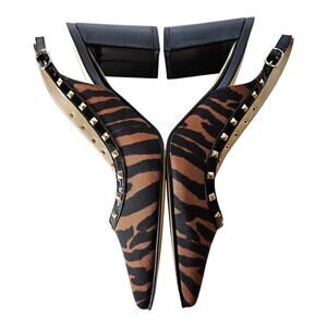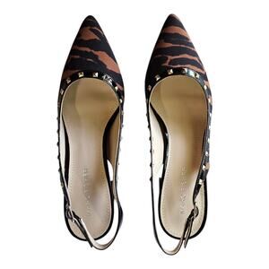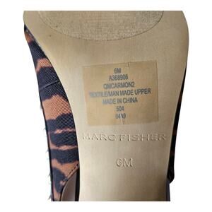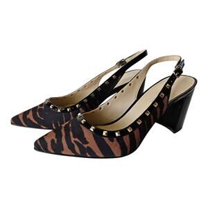 MARC FISHER Women's Size 6 M Carmon Slingback Pump Shoes - Textile Upper, Leather Lined, Tiger Pattern, Black Brown, 3" Block Heel, Gold Tone Studs, Adjustable Buckle Strap, Pointed Toe, #MAR889CQC-A-6-M