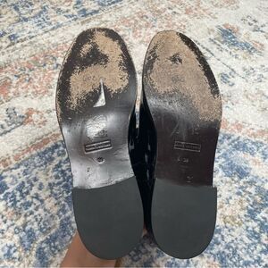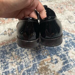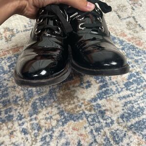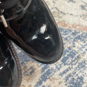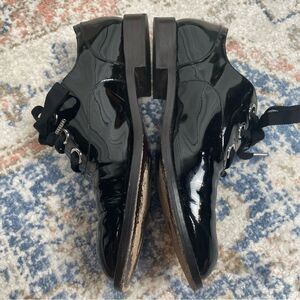 These Marc Jacob’s black patent leather Helena oxfords are in good used condition. Women’s size 39. There is some slight discoloration on the toe area of one shoe (pictured). Cute ribbon laces.