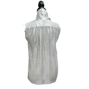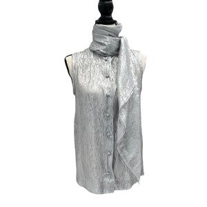 Marc Jacobs for Bergdorf Goodman silver silk lamé. Shiny silver lamé made out of silk with attached neck scarf. Scarf can be worn in many different ways! Faux button down front. Hidden snaps close the shirt. Sleeveless. It reflects light because it's semi sheer, so it can appear darker in darker light. Very good preowned condition.