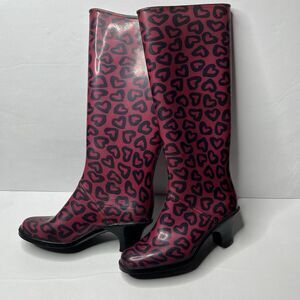 MARC JACOBS Heart Print Pink Rubber Heeled Rain Boots Womens Size 5.5 ITALY MADE