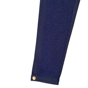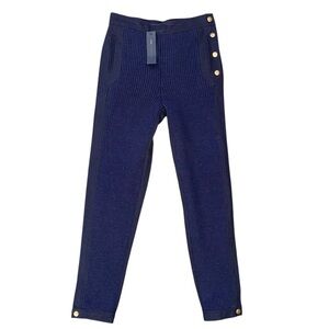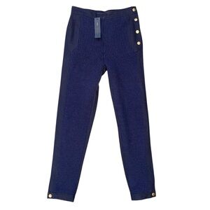 Stylish navy blue knit pants featuring gold button accents on the side. Perfect for a chic and comfortable look. Lined