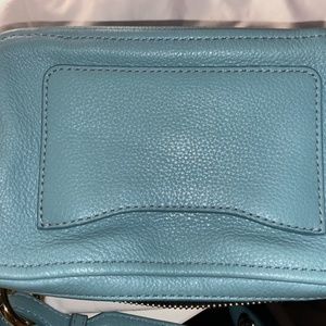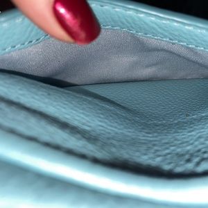 Grained leather in a sky blue-ish color with gold details. Comes with dust bag & card. Bigger than a snapshot and a lot more spacious!! Comes with 2 seperate compartments and. Adjustable and detachable strap as well. * PLEASE NOTE * the logo hardware has a scratch (second pic) Barely noticeable if not looking at it up close :) Open to negotiate!