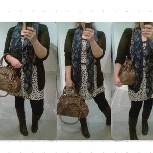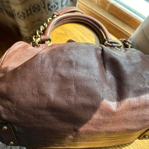 Approx. 15 in long, 11 in high and 5 in deep. The rolled leather handles have an approx 6 in drop, the detachable chain has an approx 13 in drop.