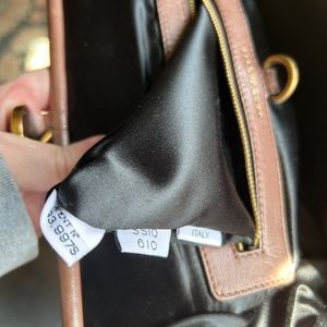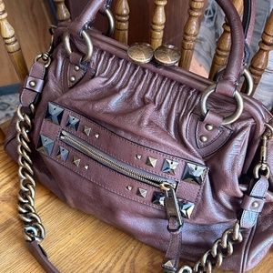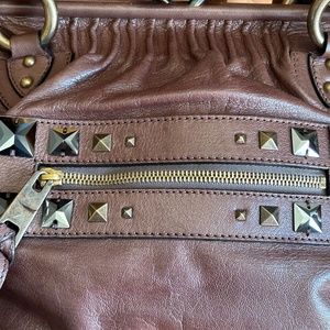 I believe this is goat (chevre) leather with a light metallic sheen. The color is taupe, but when it catches the light, it has dusty rose undertones. The studs are crystals & the hardware aged bronze. The lining is black satin.