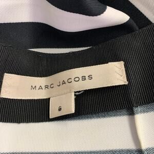 MARC JACOBS skirt in a black and white polyester fabric featuring a stripe pattern, pencil style, silk lining, and back zipper closure. Made in USA.