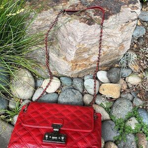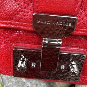 Dark red genuine leather quilted purse with contrast stitching from MARC JACOBS, flap front closure with a single pocket with zipper inside can be worn two ways, either as a shoulder purse or Cross body Purse ! Hammered metal closure with link chain and leather straps.