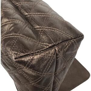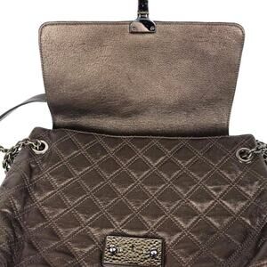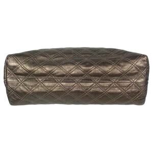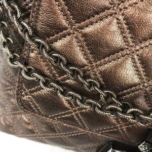 Marc Jacobs Extra Large Baroque Single Shoulder Bag. Retail $1,050. Made in Italy. Double-stitch quilted lambskin leather in metallic bronze. Hammered silvertone push-lock closure. Pull-through leather chain shoulder/crossbody strap with leather shoulder guard. The interior is lined with black canvas fabric and features two open compartments and one pocket with a zipper closure, and imprinted 'Marc Jacobs Made in Italy' in gold lettering. This bag is a classic wardrobe staple.