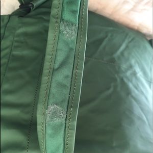MARC BY MARC JACOBS green hackey sac backpack- Rubbery/ waterproof material- sold by marc jacobs japan, RARE style, has large pockets and is a large back pack, holds a lot of stuff, has some flaws, the original cord was extremely frayed so i had to get it fixed- that is different from original style, also some flaws on inside of back strap and some poked holes in the top part of the inside of the bucket- has good storage on the inside with card holders and key holder, and a pouch on the back