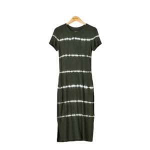 A chic tie dye print completes this easy midi T-shirt dress featuring functional pockets. True to size with relaxed fit. High-stretch fabric. Designed to hit at mid calf. Approx. 44" from high point shoulder to hem, based on a size small. Round neck, Short sleeves, Pullover style, Two side pockets. 95% Rayon 5% spandex. Color: Olive Green.