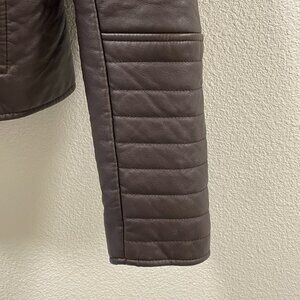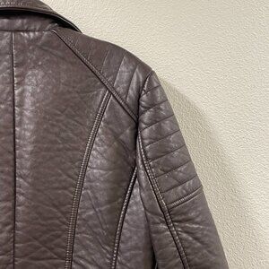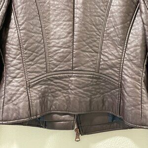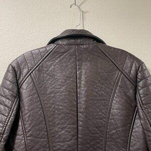 * Angle zip front, fitted faux/vegan leather jacket in VERY deep burgundy (might look brown in some lights)