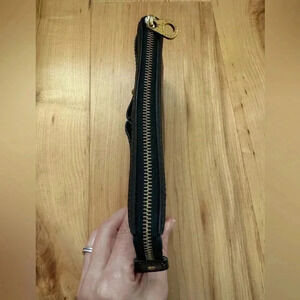 This classic, understated black leather wallet is a staple piece for a classy, edgy, sophisticated look. Two exterior pockets with working twist closures and brass-colored detailing. Interior card slots and zipper pouch. Has some wear but still lots of life left!