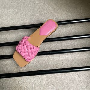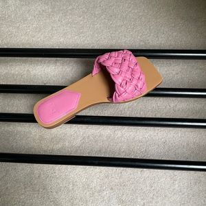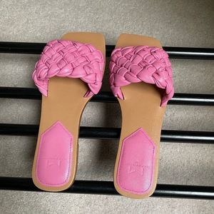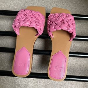 An eye-catching design featuring intricately woven, puffy strips defines this breezy slide sandal fashioned with a square toe.