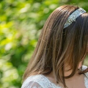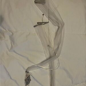 Absolutely stunning and elegant lace headpiece embellished with gorgeous crystals. Ends of the headpiece are lined with crystals for a beautifully detailed tie. (Shown in 3rd photo)