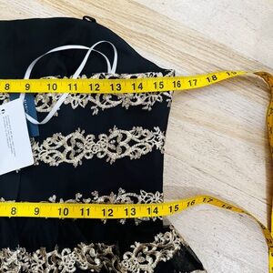 Featuring embroidery on tulle, the Metallic Filigree Midi Dress is an A-line midi dress with a strapless bodice and 5-tiered skirt.