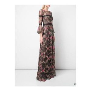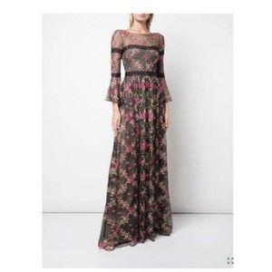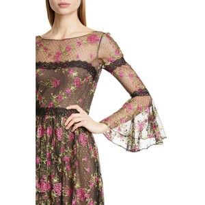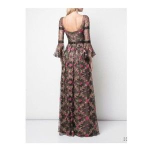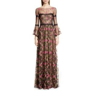 MARCHESA NOTTE Black Floral Embroidered Lace Long Bell Sleeve Romantic Gown 4 US
