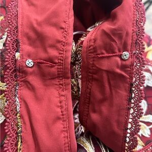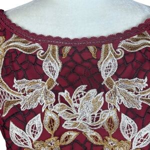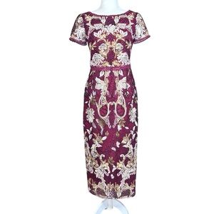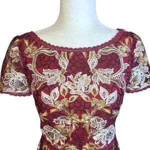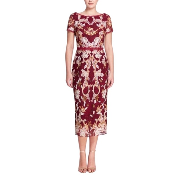 boat neckline short sleeves fitted bodice column skirt embroidered guipure floral motif midi tea dress imported dry clean color: burgundy