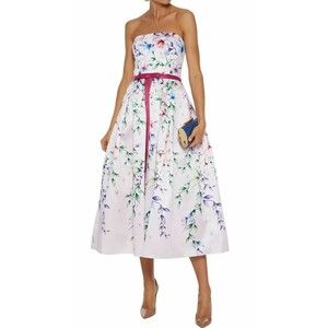 Strapless printed mikado piqué corseted tea-length gown with pockets and satin ribbon waist trim.
