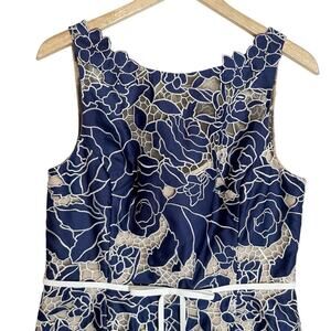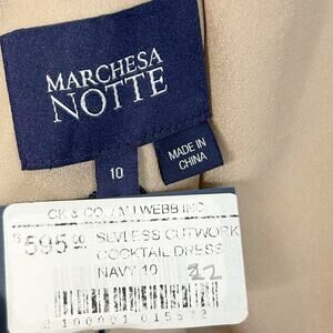 Elegant and timeless, this Marchesa Notte sleeveless sheath dress features a stunning navy lace overlay with delicate floral detailing and a nude underlay for a subtle contrast. Designed with a flattering tailored silhouette, scalloped edges, and a hidden back zip, this cocktail dress is perfect for weddings, evening events, and special celebrations.