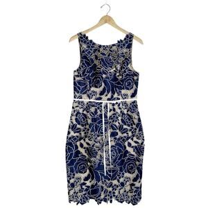 Keywords: Marchesa Notte lace cocktail dress, navy floral lace sheath, formal event dress, mother of the bride dress, wedding guest outfit, gala and cocktail party dress, elegant evening wear, timeless formal dress, refined special occasion dress, luxury occasion wear, romantic lace midi dress, spring and summer wedding style, black tie event ready, polished feminine look, evening glam, old money aesthetic, semi-formal, dinner, ceremony, rehearsal, engagement party
