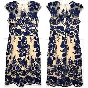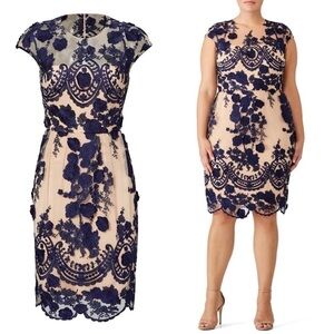 MARCHESA Navy Floral Embroidered Rosette Cap Sleeve Beige Tulle Sheath Dress 0