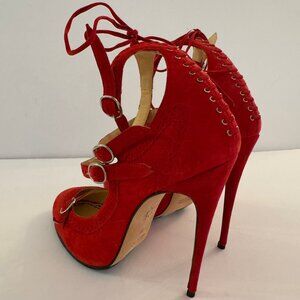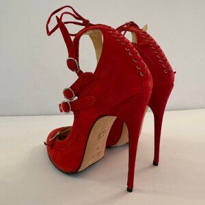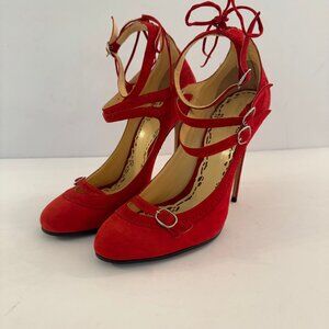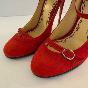 MARCHESA, Red Suede Mary Jane Pumps in Good Condition. Laces show some wear. Please see pictures for more details.