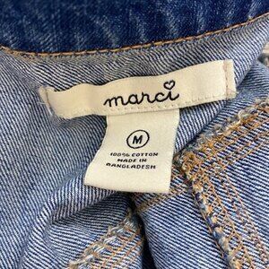 MARCI Distressed Denim Jean Trucker Jacket Sequin Pineapple Back Size Medium. Excellent preowned condition.