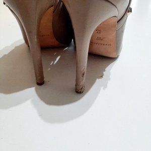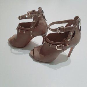 MARCIANO Gold Studded, Taupe Beige, Open Toe, High Heel, Trendy Booties, SZ 7M.