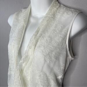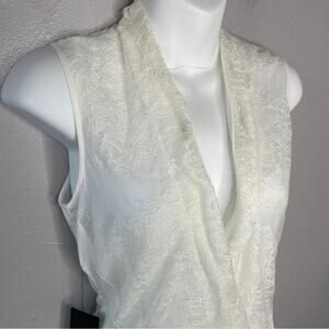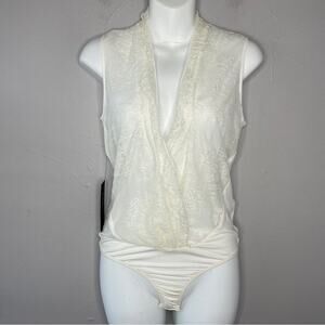 White/ivory lace overlay sleeveless bodysuit with deep v-neckline that has a faux wrap style. Buttons on bottom.