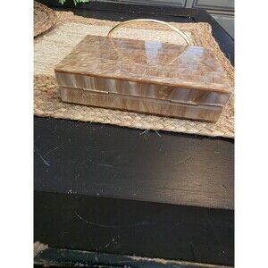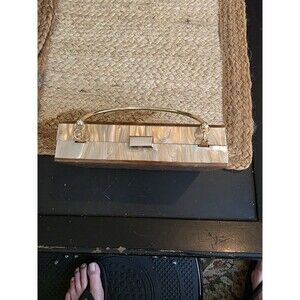 The MARCIANO Los Angeles Pearl Colors Acrylic Clutch is a stylish and unique accessory perfect for parties or formal events. This mini clutch features a rectangular shape with a beige exterior color and gold hardware, adding a touch of glamour to any outfit. The clasp closure and gold handle/strap detail make it easy to carry and perfect for a designer look with a hint of 80s vibe. Made of acrylic with a polyamide lining in beige, this clutch is sure to make a statement while offering both functionality and fashionable style.