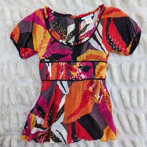 MARCIANO Silk & Cotton Tropical Print Fuchsia Orange.Floral Puff Sleeve Top, XS