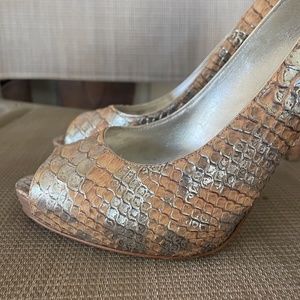 Silver and tan leather snake scaled textured embossing. Open toe. Leather lining and leather soles.