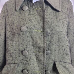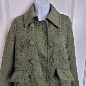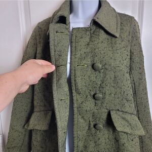 Beautiful green pea coat from Marciano. Not sure of the fabric content, but it feels like it has wool in the outside fabric. Lined with a soft satin style fabric. In a deep olive green color. Please see measurements for size.