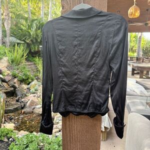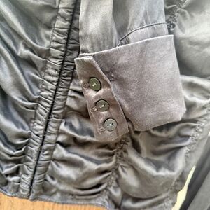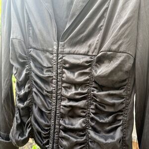 MARCIANO black silk ruched collared long sleeve blouse. Slightly faded as pictured and priced accordingly.