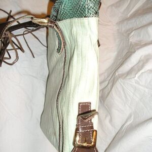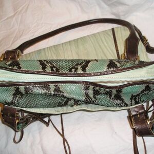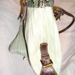 Fetching Marco Buggiani purse, made in Italy, in leather embossed with a lizard pattern and trimmed in snake embossed and plain brown leather. Goldtone buckles and long leather tassels.
