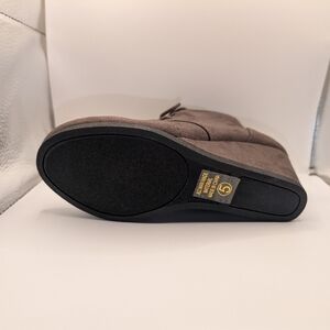 These mid-rise wedge ankle boots with almond closed toes and comprised of premium faux suede upper and laced-up front. Matching, covered wedge heel and synthetic sole. Original retail is $120.