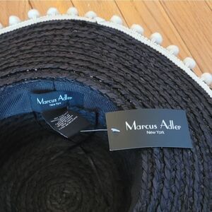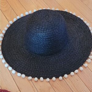 MARCUS ADLER RAFFIA BLACK HAT WITH WHITE POM POMS