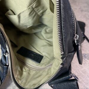 Black leather moto style crossbody bag by Margot New York.