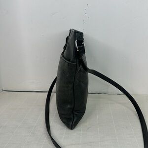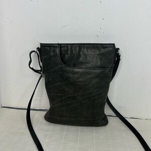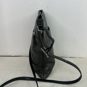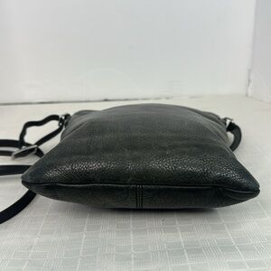 Color: black pebbled finish, adjustable crossbody strap, logo branded bottom of bag 8.5in W x 10.5in H 51in strap, fully extended zip closure 1 interior slip pocket, 1 interior zip pocket 1 front pocket, 1 back pocket leather imported