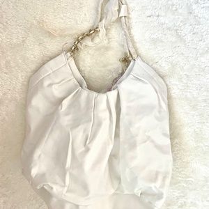 Mariah Carey "M" bag. White faux leather, never used, still with factory wrap around handle and charm. Lightweight.