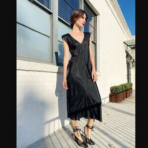 Light and airy, this 90s Mary Clayden tissue thin silk dress is a dream on. The structured shoulder padded detailing on this dress creates such a current silhouette. Front and back low V neckline with a straight body and fishtail shape on both front and back sides of the dress. This piece has no closures and slips over the head easily. So simple and chic.