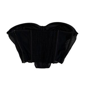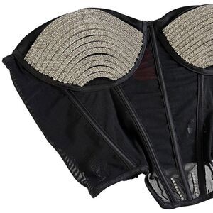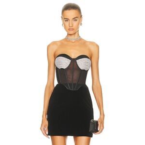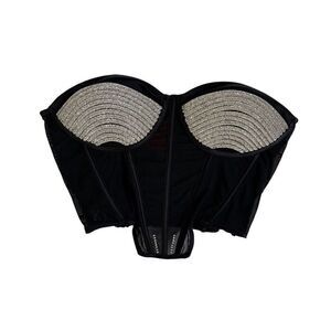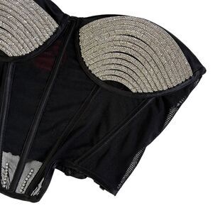 MARIANNA SENCHINA Crystal Cry Top in Black 100% polyester. Made in Ukraine. Dry clean only. Exposed side zipper closure. Padded cups with crystal embellishment. Boned mesh bodice with smocked back. MSNA-WS10. MS/FW2223-704T.