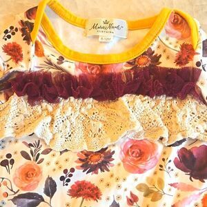 Adorable floral baby romper with long sleeves and ruffle details. Features a mix of pink, cream, and burgundy colors.